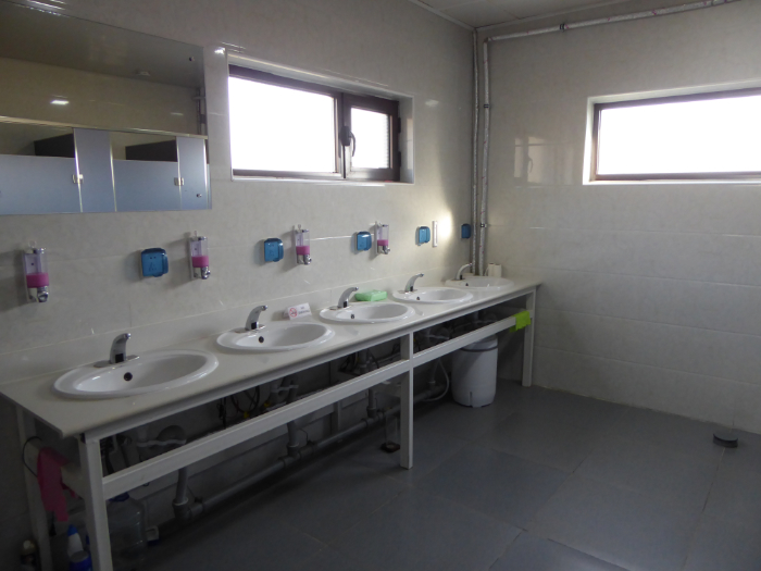 ツーリストキャンプの中央にある建物には、男女別の洗面所やトイレ、シャワー室などの設備が整っています。